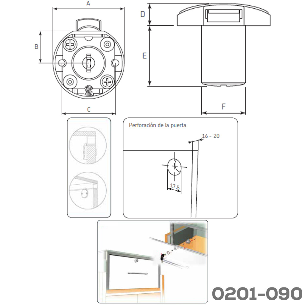 Cerradura gabinete (de madera) redonda de resbalón CL zamak Ø=16,5mm cañon 22mm con cilindro C1
