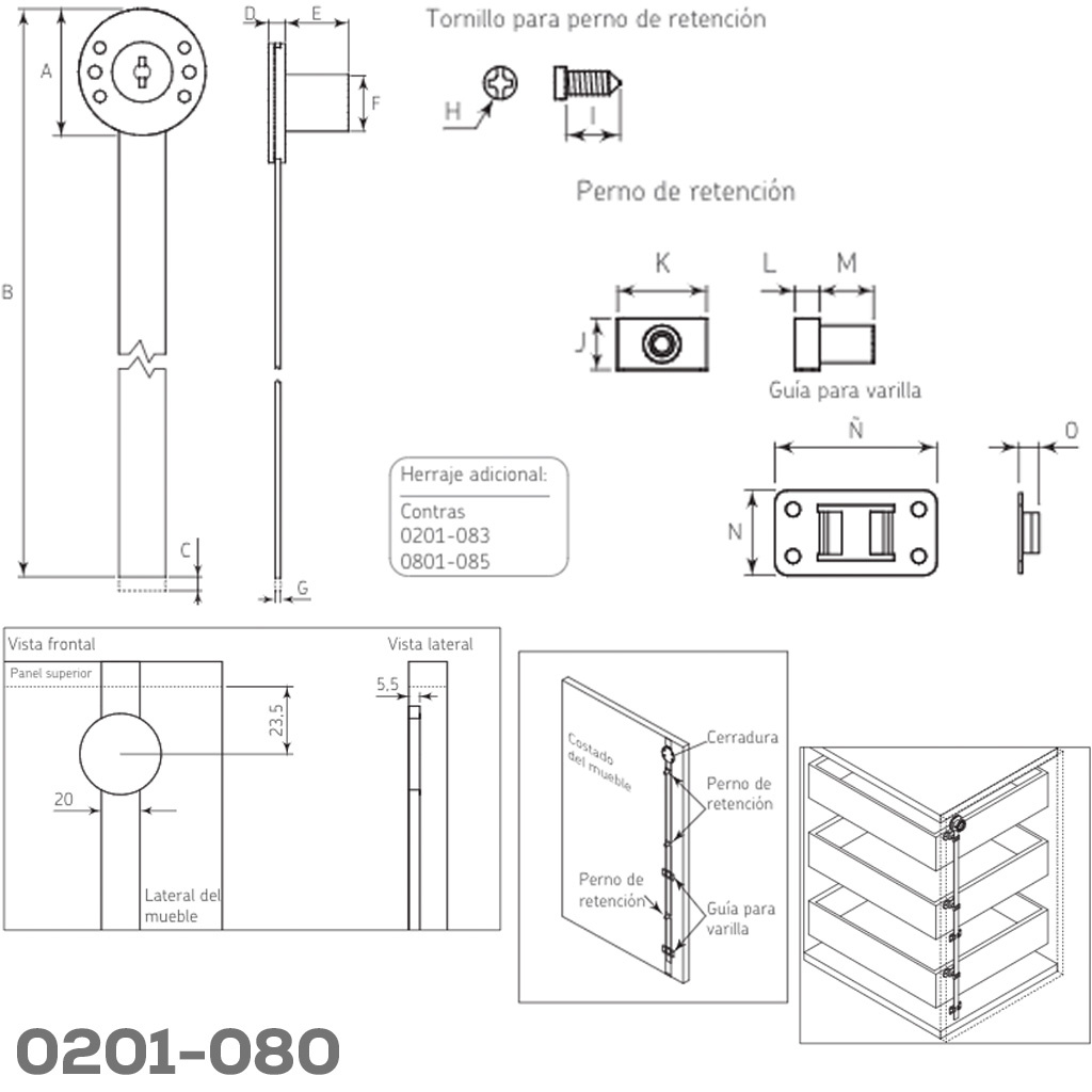 Cerradura para archivero 3 cajones instalación lateral Cerrajes L=600mm negra