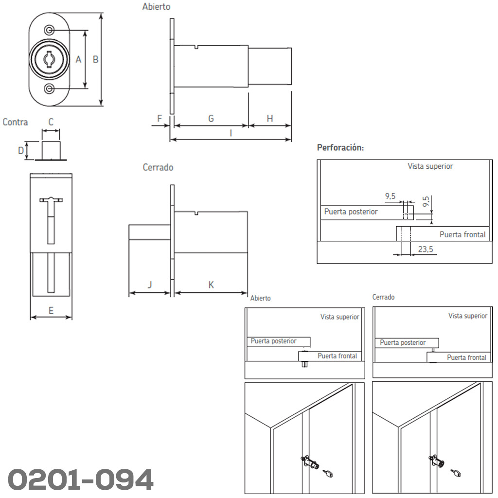 Cerradura gabinete madera rectangular 2 puertas CL zamak Ø=17,5mm cañon 22mm c/cilindro C1