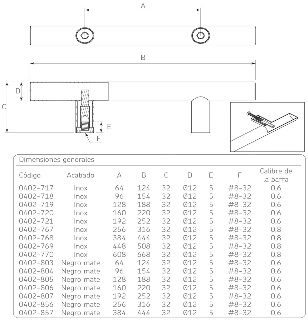 Jaladera barra hueca Acero Inoxidable cc 128 mm L=188 mm 4470 I91 Negro mate Tornillo #8 – 32×1″