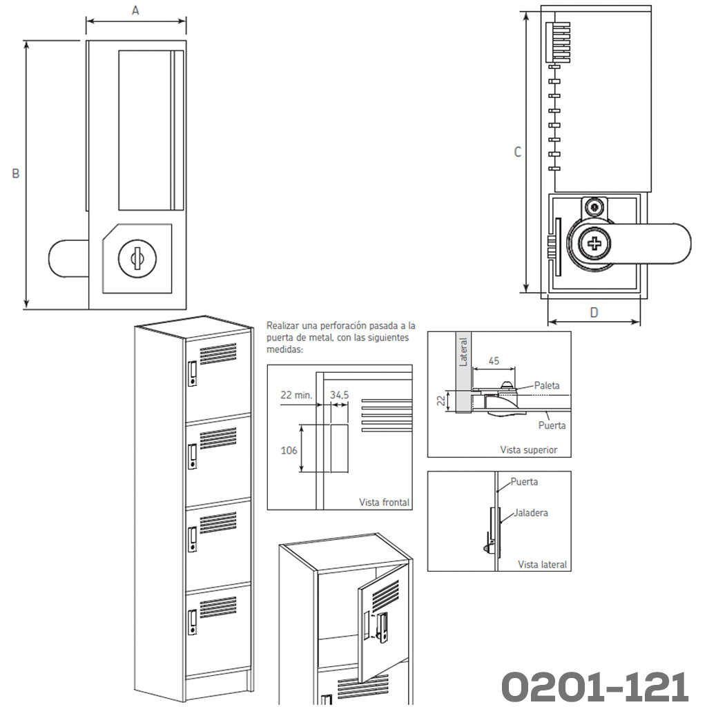 Cerradura de combinación para puerta de metal 0,6-1,0mm de paleta CL plástico H=83mm L=20mm Inicia sesión para ver precios